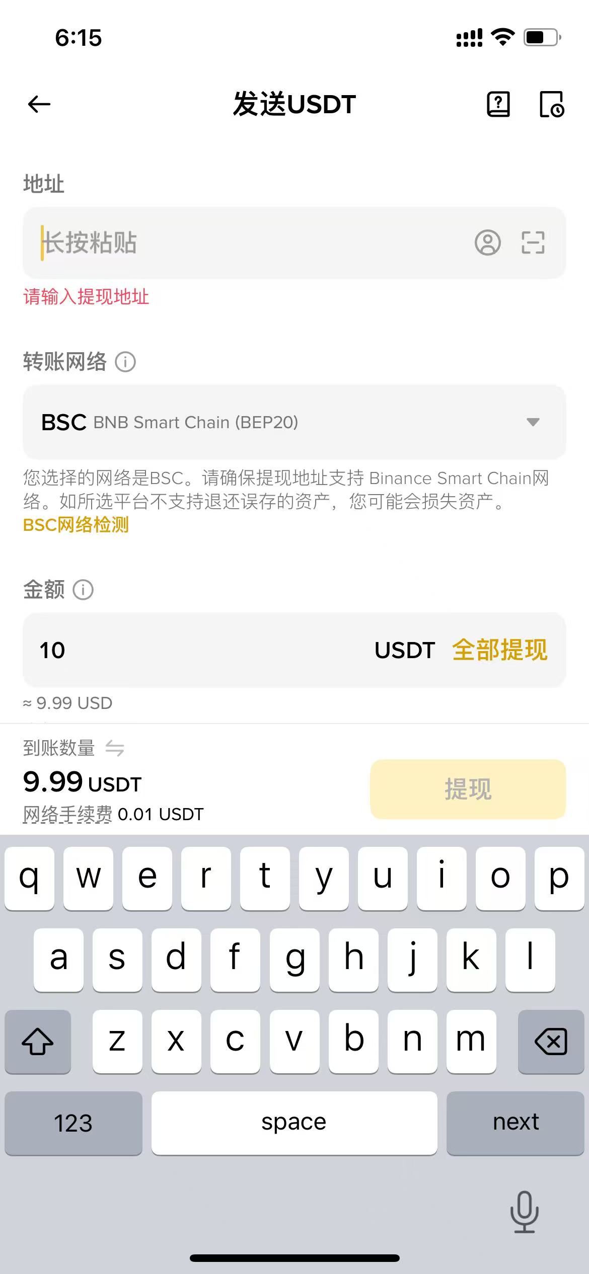 再到币安平台上,网络选择bsc,把地址填上去,然后提现就可以了