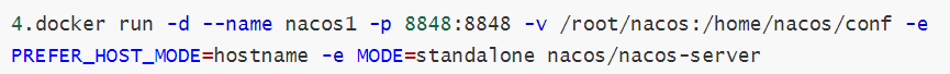 docker run -d --name nacos1 -p 8848:8848 -p 9848:9848 -v /root/nacos:/home/nacos/conf -e PREFER_HOST_MODE=hostname -e MODE=standalone nacos/nacos-server