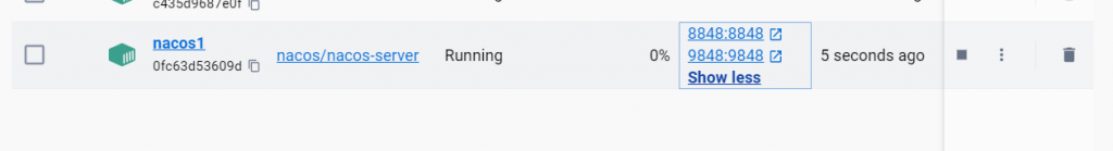 4.docker run -d --name nacos1 -p 8848:8848 -v /root/nacos:/home/nacos/conf -e PREFER_HOST_MODE=hostname -e MODE=standalone nacos/nacos-server